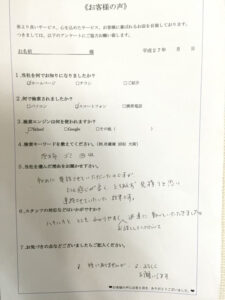 遺品整理・生前整理 ゴミ屋敷片付け 迅速に動いて頂きました。 Y様 before after アンケートより Q当社を選んだ理由をお聞かせください。 A初めに電話させて頂いたのですが、とても感じが良く、とりあえず見積もりと思い連絡させて頂きました。 Qスタッフの対応はいかがでしたか? Aハキハキととてもわかりやすくご説明して頂いて迅速に動いて頂きました。 Qお気付きの点がございましたらご記入ください。 A特にありませんが、又ご利用しますので宜しくお願いします。 不用品回収なら、即日対応の関西プロスタッフへ 電話からご予約