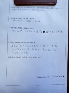 - A早くてきれいにしてもらって助かりました。 どうなるかと思ったけど全てなくなり、ほっとしました。