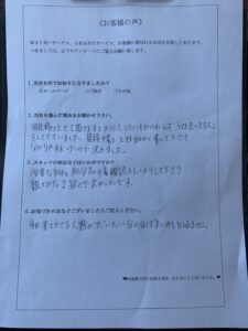 - A相見積もりさせていただきますとお伝えしたにもかかわらず、 とても良い対応をして下さいました。 見積もり書もとても細かく書いてくださり、分かりやすかったので決めました。