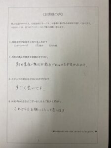 他の業者様で相見積もりも取られたとのことでしたが、当社の方が料金も良心的だったことや、見積り時のスタッフの対応も良かったこと、以前にご利用された際にスタッフの対応も作業も丁寧だったことから、今回も当社にご依頼をいただくことができました。