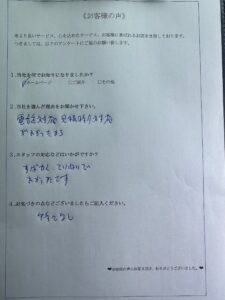 電話対応を行ったスタッフや、見積もり時にお伺いしたスタッフの対応が丁寧で、好感を持ってくださったことが決め手となり、当社にご依頼をいただくことができました。